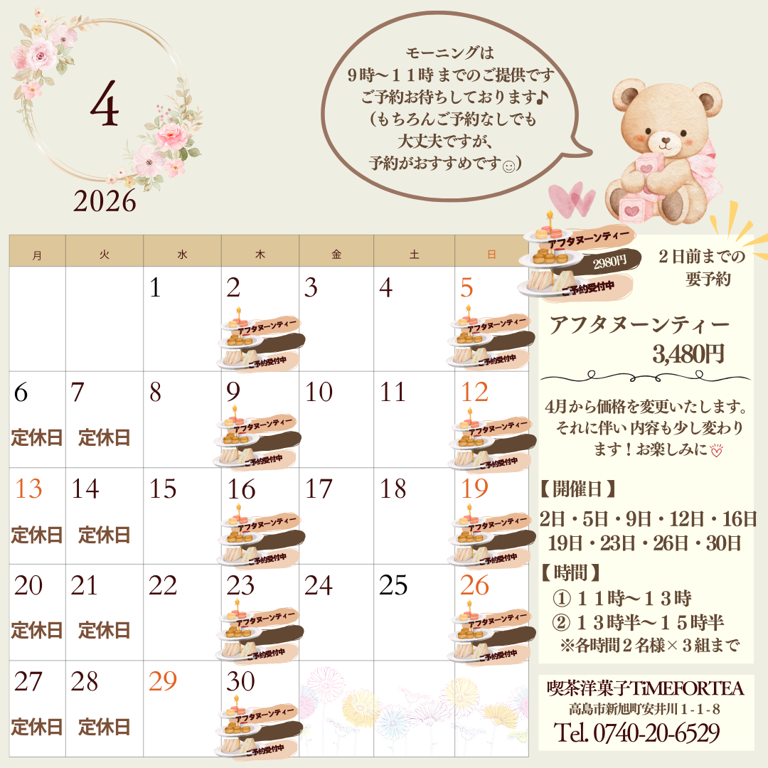 4月のカレンダーです! 4月からアフターヌーンティーの価格を変更いたします。おひとり3,480円です。それに伴い、内容も少し変わります!お楽しみに(^^)/ アフターヌーンティーは2日前までの要予約です(空きがございまし […] -