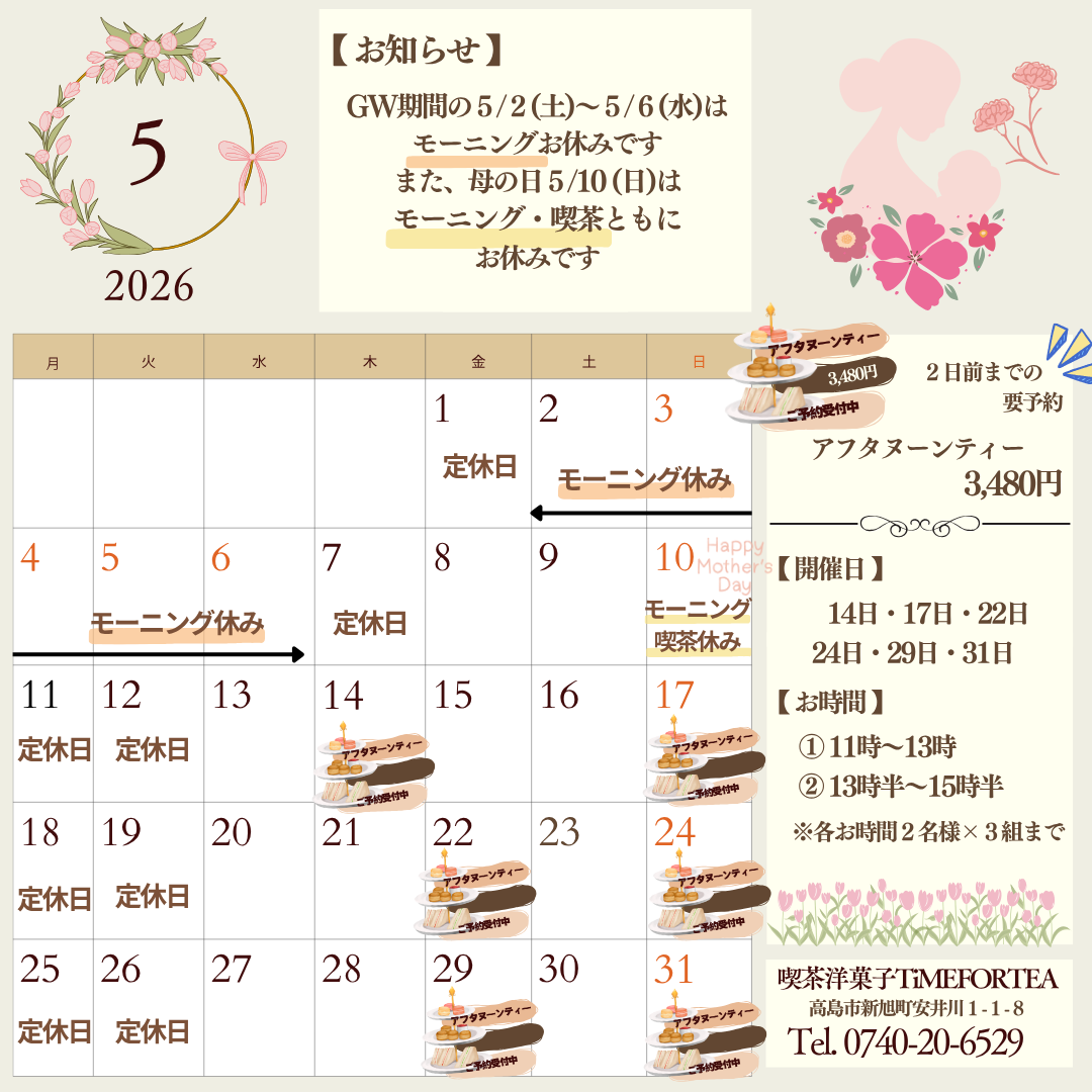 5月のカレンダーです! GW期間、5/2(土)~5/6(水)はモーニングお休みです。母の日の5/10(日)は喫茶・モーニングお休みです。 アフターヌーンティーは2日前までの要予約です。空きがございましたら、前日でもお伺い […] -